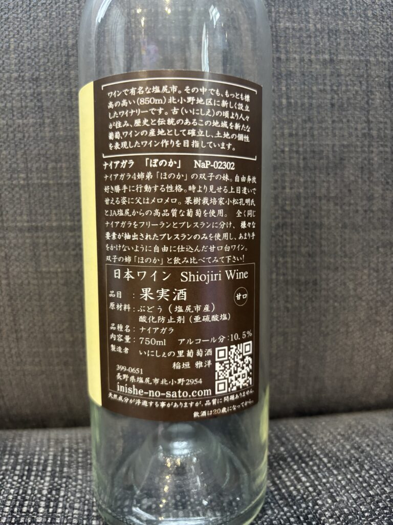「ぽのか(いにしえの里葡萄酒)2020」は、長野県塩尻市北小野産のナイアガラ種から造られた日本ワインです。酸味は控えめで、非常に穏やかな味わいが特徴。派手さはありませんが、静かに飲み進められる一本です。飲み頃は今から数年以内がおすすめで、冷やしすぎず常温に近い温度で楽しむと繊細な風味が感じられます。グラスはシンプルな白ワイングラスが合います。軽めの和食や淡泊な魚料理と合わせると、ワインの優しい味わいが引き立ちます。控えめながら落ち着いた時間を演出する一杯です。