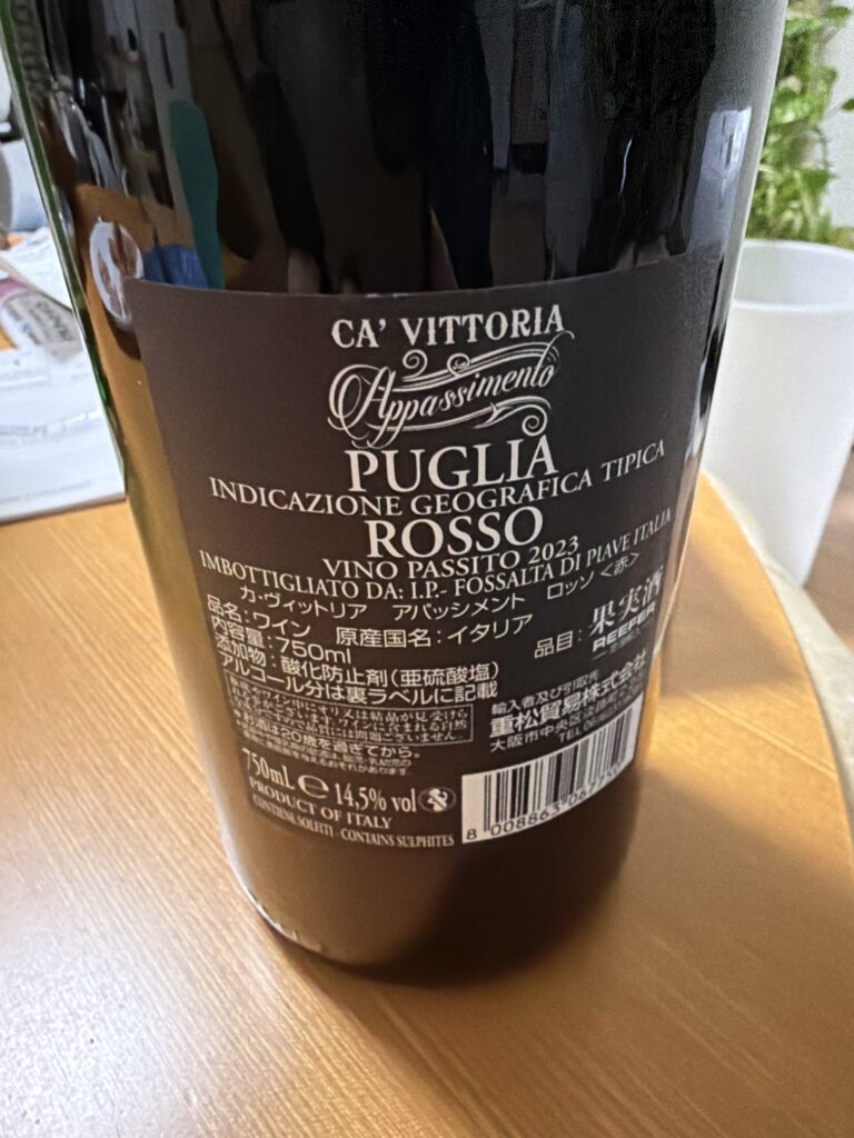イタリア・プーリア産の赤ワイン「アパッシメント(カ・ヴィットリア)2023」は、独特の製法でじっくりと乾燥させたブドウを使用し、深みのある味わいが期待されます。酸味は少なめ、果実味、樽香は強く、穏やかで甘い飲み口が特徴です。飲み頃はやや冷やしてからが良く、16〜18度程度が適温。広めの赤ワイングラスでゆったりと楽しむのがおすすめです。肉料理や熟成チーズと合わせると、ワインの落ち着いた旨みが引き立ち、食事とのバランスも良くなります。スコアは控えめですが、日常使いに適した一本です。
